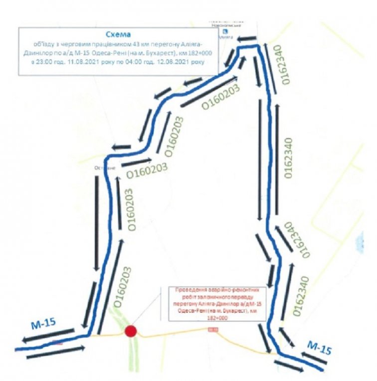 Схема организации дорожного движения на период запрета движения автотранспортных средств на автодороге М-15 Одесса-Рени, км 182 + 000, прилагается.