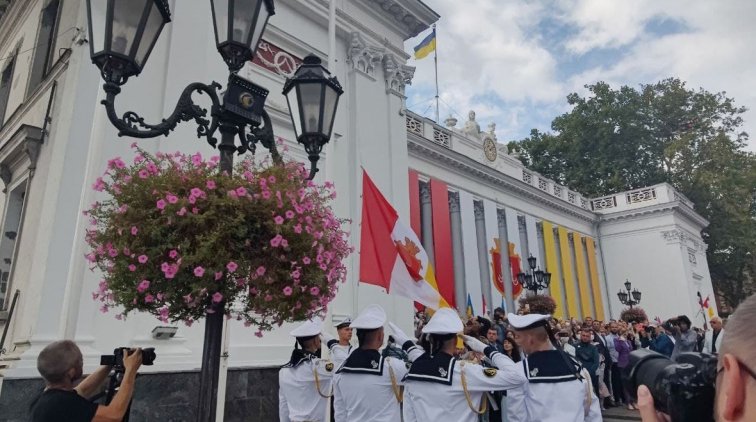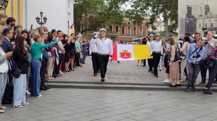 Празднование дня города началось на Думской площади. Курсанты торжественно подняли флаг Одессы. В торжественной церемонии приняли участие первые лица города, военнослужащие, представители иностранных делегаций, ветераны и простые одесситы.