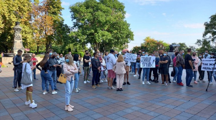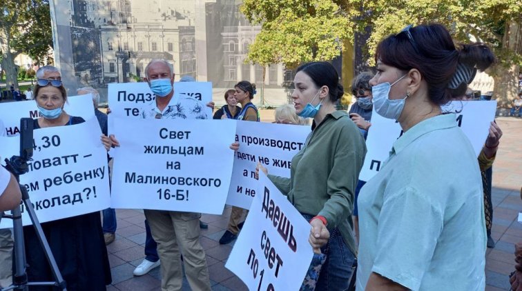 Жильцы домов № 16 и 16а по улице Сахарова и ул. Марсельской, 60, которые три года платят за свет по промышленному тарифу, протестуют перед зданием одесской мэрии утром 15 сентября. Протест приурочен к началу сессии горсовета.