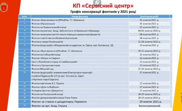 Одесское КП «Сервисный центр» разработало график консервации городских фонтанов. Так, консервировать фонтаны начнут уже с 1 октября.