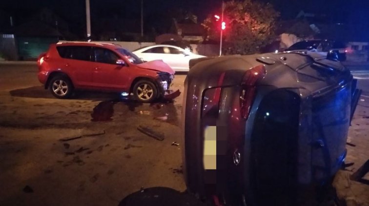 Дорогу не поделили Toyota RAV 4 и Hyundai Sonata. В результате удара «кореец» перевернулся на бок.