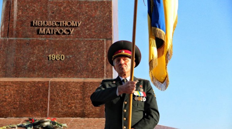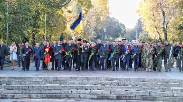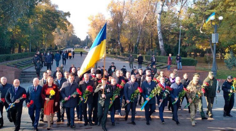 В День освобождения Украины от фашистских захватчиков официальная делегация из городских и областных чиновников приехала в парк Шевченко, чтобы возложить цветы к памятнику Неизвестному матросу.