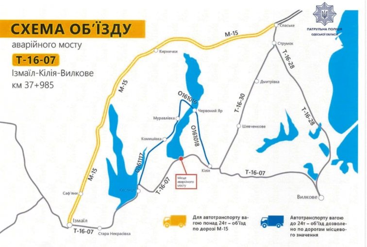 Патрульная полиция Одесской области сообщила о перекрытии участка автомобильной дороги Т-16-07 на участке 37+985 км в связи с аварийным состоянием моста, передает “Бессарабия INFORM”.