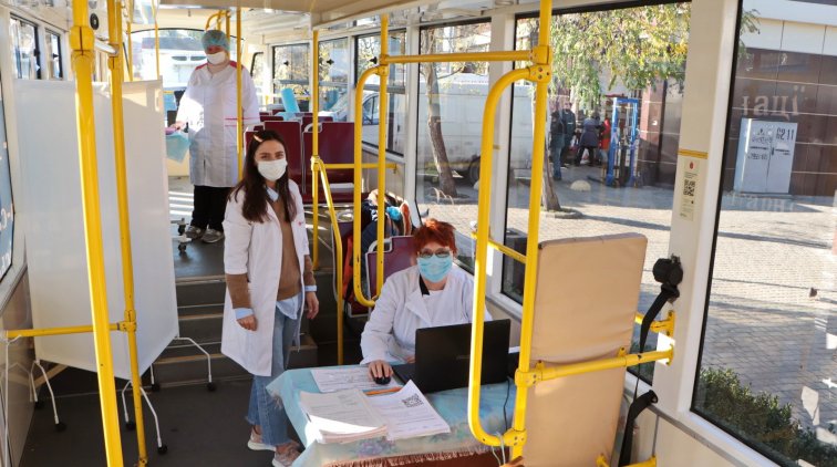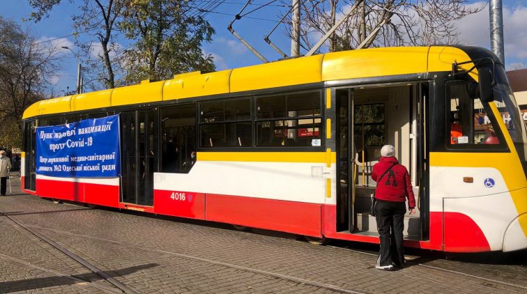 В Одессе начали делать прививки от коронавируса в трамвае. Для этого вышел на маршрут один из новых трамваев одесской сборки – «Одиссей», назвали его вакцинационным и разместили на Старосенной площади, возле конечной остановки трамваев и автостанции.