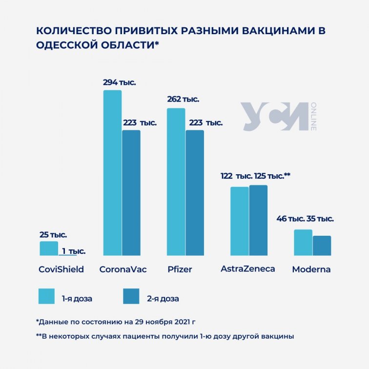 Одесситы и жители области отдают предпочтение вакцине CoronaVac, меньше всего людей выбирали CoviShield.