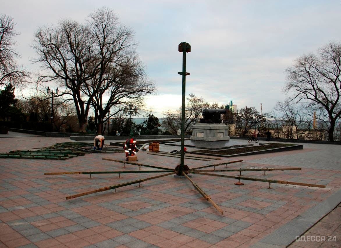 В Одессе на Думской площади начали устанавливать сцену для новогодних празднований. 27 декабря металлические конструкции стали собирать прямо у новогодней елки и осьминога.