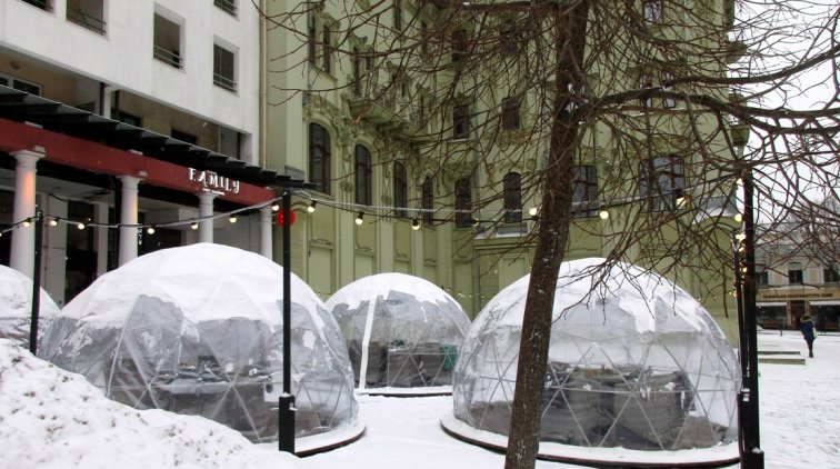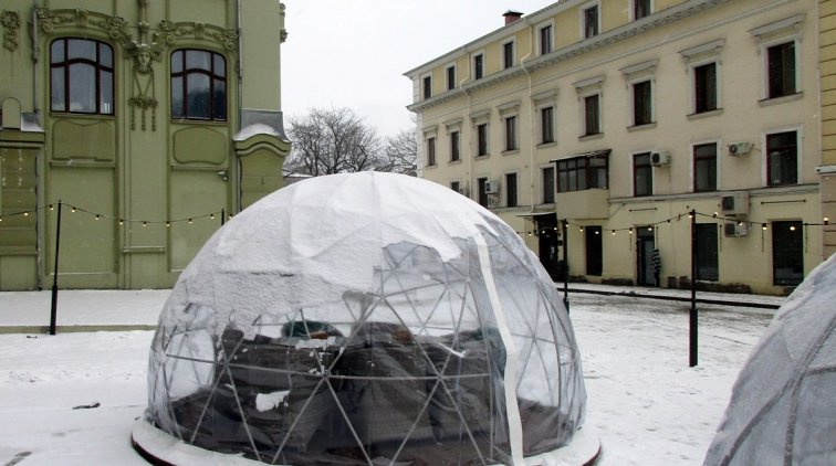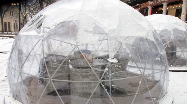 Нет, никак не иглу. Хотя смотрится довольно необычно. По сути, это такие палатки из пластика. Внутри — сиденья и столики. То есть, если вы не хотите сидеть в кафе, а хочется на открытой местности, но чтобы и с удобствами — вам сюда. Снег или дождь вам уже не помешают.
