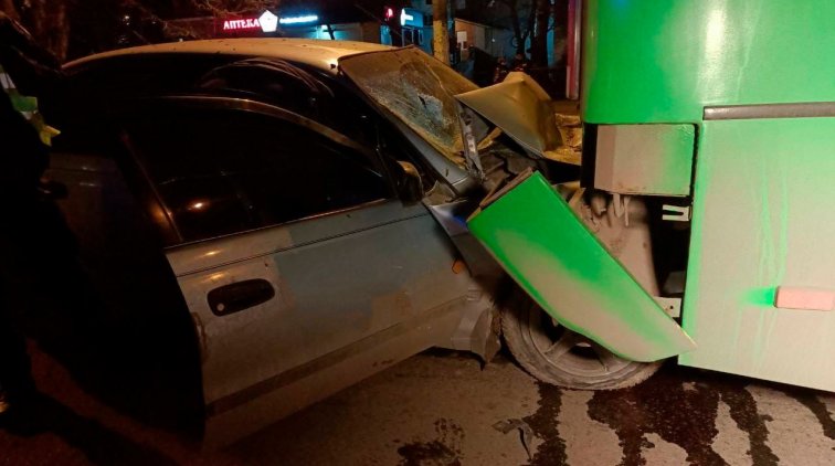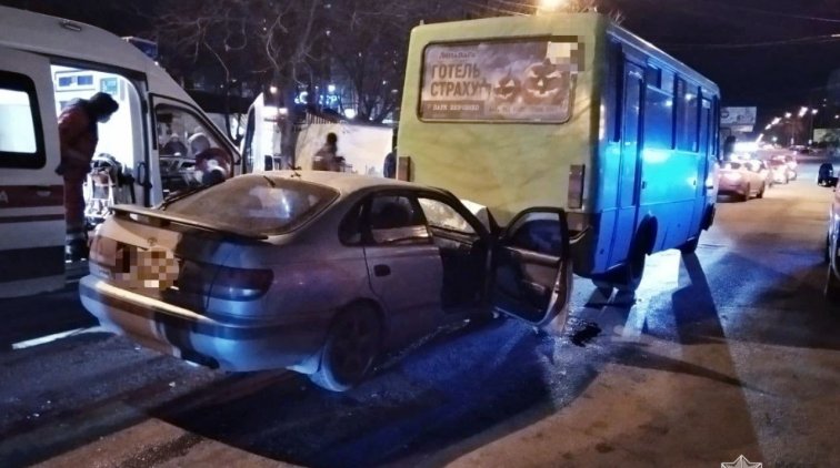 Авария произошла вечером, 9 февраля, на улице Заболотного. Toyota Carina на большой скорости влетела в заднюю часть 232 маршрутки. Троих человек забрали в больницу. По предварительной версии водитель авто и его пассажиры были пьяны.