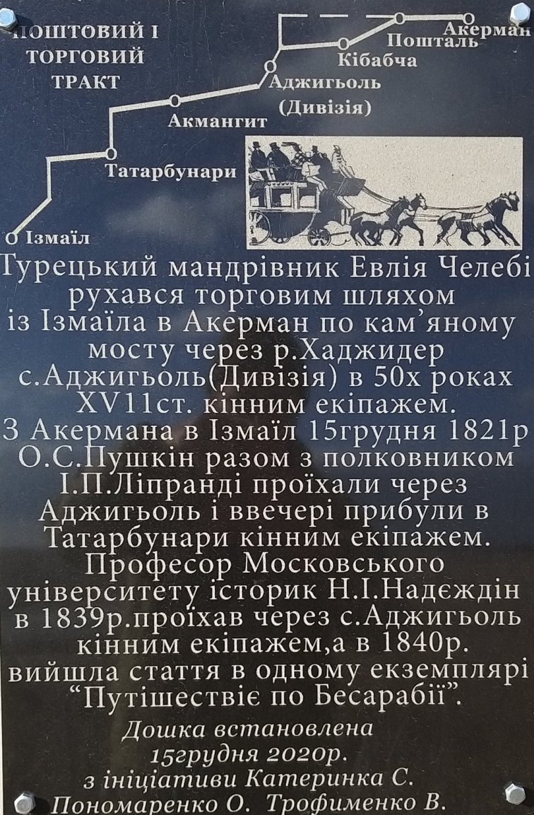 Мост сооружен в 17 веке местным каменщиком из камня-дикаря. Через него когда-то путешествовал в середине 17 века известный турецкий путешественник Эвлия Челеби. Он двигался торговым путем из Измаила в Акерман. Тогда деревня, через которую он двигался и где был построен великолепный мост называлась Аджигель. Сейчас это село дивизия.