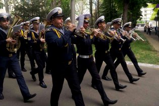Колонна курсантов Национального университета «Одесская морская академия» под музыкальный аккомпанемент оркестра торжественным маршем прошла по всей Одессе.
