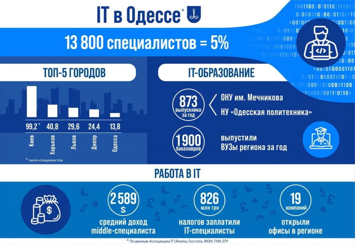 Отметим, в Одессе среди наиболее крупных вузов, обучающих будущих разработчиков — ОНУ им. Мечникова и НУ «Одесская политехника». За год два университета выпустили 870 бакалавров, что составляет половину всех выпускников IT-специальностей в регионе.