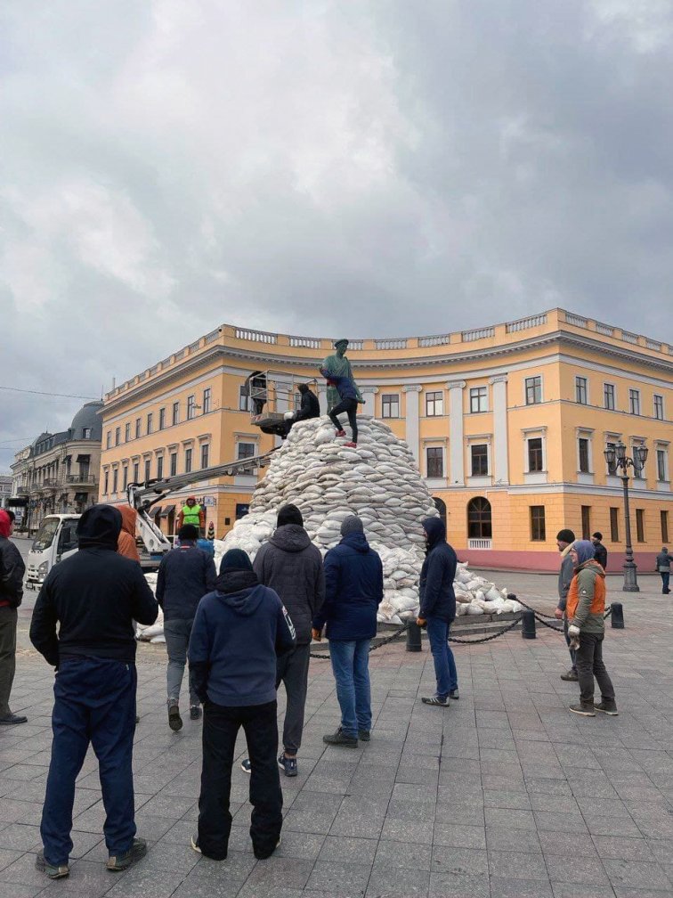 Вокруг памятника герцогу де Ришелье складывают мешки с песком.