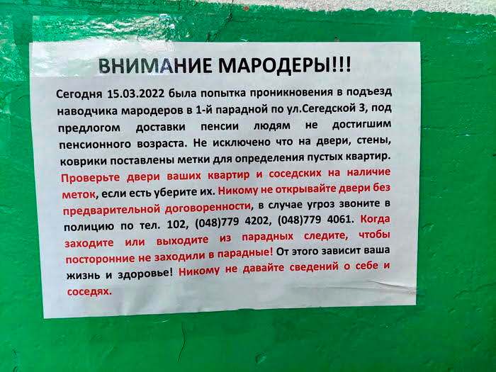 Так в домах на улице Сегедской замечено объявление, в котором сообщают о попытке проникновения в подъезд под видом доставки пенсии пожилым людям. Как правило, проникнув в подъезд, мародеры начинают устанавливать специальные метки – заклевать скотчем замочную скважину, засовывать бумажки или спички в дверь. Одесситов просят уничтожать такие метки на всех дверях в подъезде, если обнаружат.