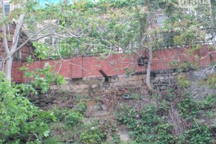 На фото видны трещины и деревья, которые растут сквозь опорную стену.