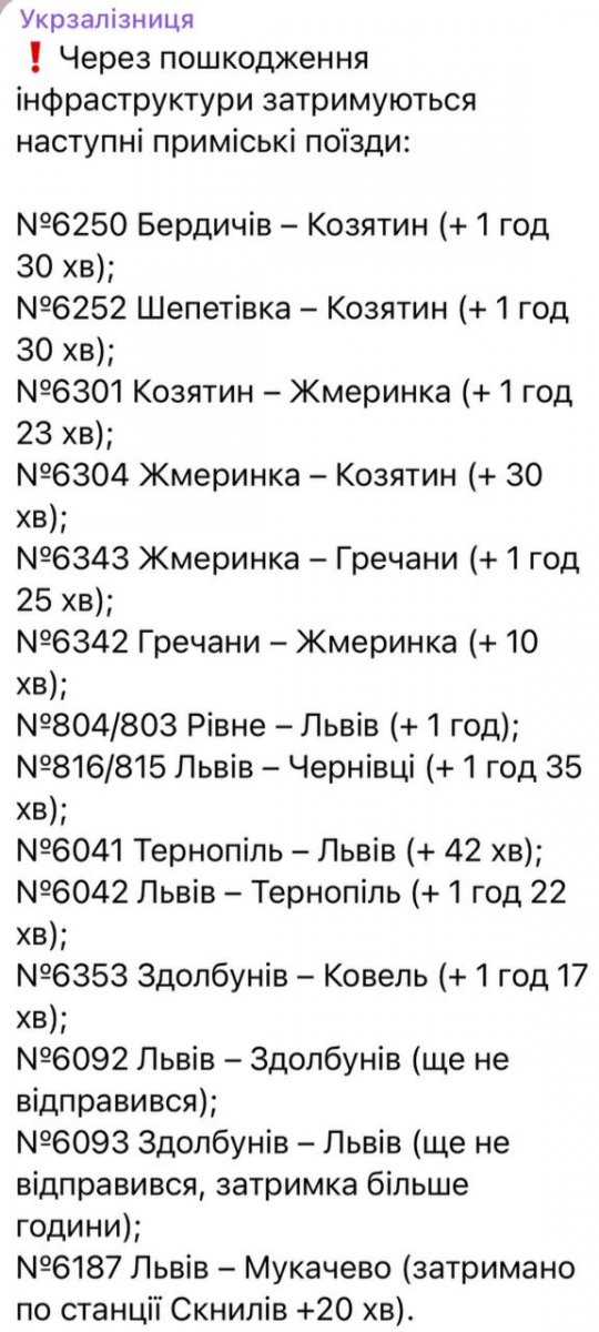 Также в УЗ опубликовали время задержки (от 1 до 4 часов) и перечень поездов.