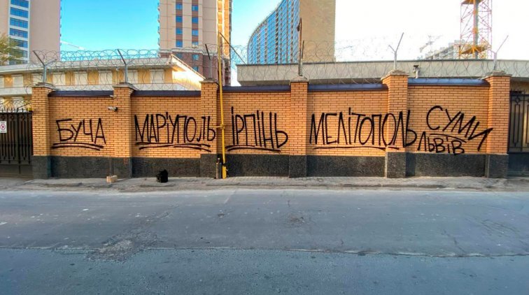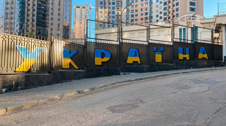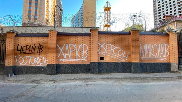 Генеральное консульство РФ в Одессе, что на Гагаринском плато, неизвестные разукрасили забор цветами украинского флага. Также там появились названия городов Украины.