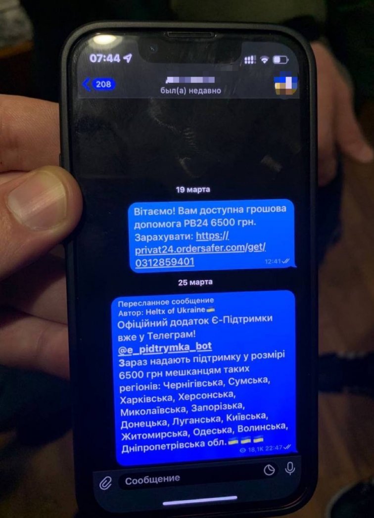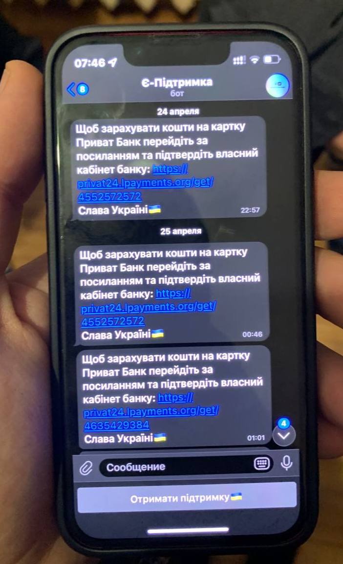 Злоумышленники, используя мессенджер Telegram, распространяли ссылки на собственные фишинговые сайты с соответствующей маркировкой программ «єПідтримка». Информация, а именно реквизиты карт и персональные данные, которые оставались на сайтах, в дальнейшем использовались для похищения денежных сбережений граждан.