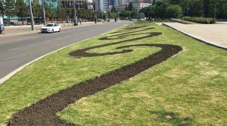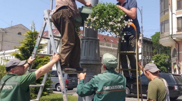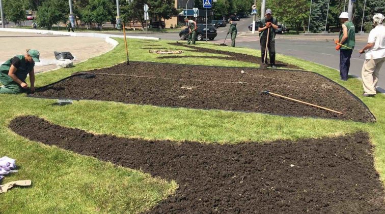 Весной сотрудники предприятия создали на площади цветочную композицию-герб Украины из тысяч желтых и синих виол. Сейчас на месте весенних цветов озеленители высадят тысячи летних – агератум, тагетис и бегонию. Кромку на вензелях, украшающих клумбы, планируют выделить из золотистой бирючины.