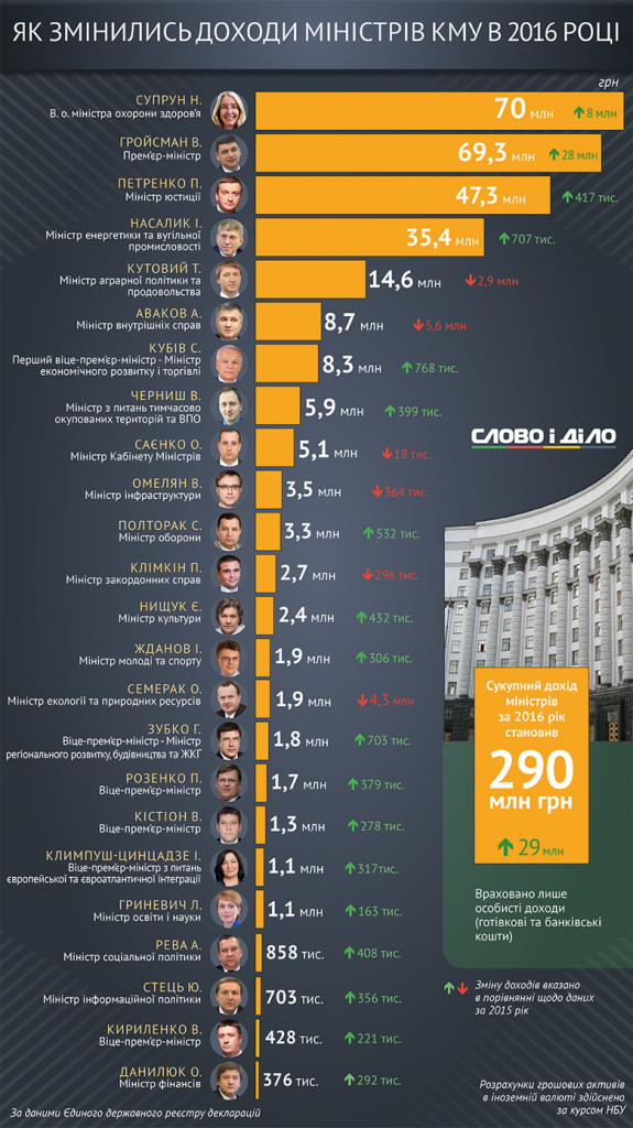 Состояние министра энергетики и угольной промышленности Игоря Насалика, согласно его декларации, в 2016 году составило 35,4 миллиона гривен и возросло более чем на 700 тысяч гривен за год. Что касается министра аграрной политики и продовольствия Тараса Кутового, то в 2016 году он стал беднее почти на 3 миллиона гривен - состояние министра снизилось до 14,6 миллионов гривен.