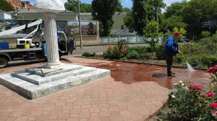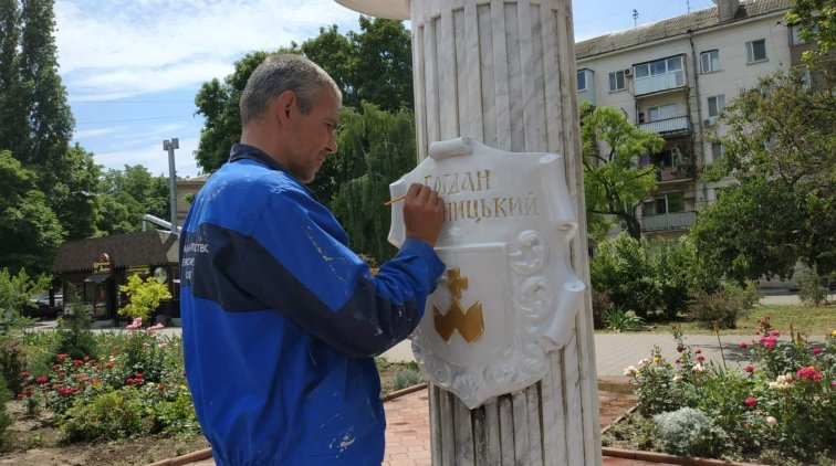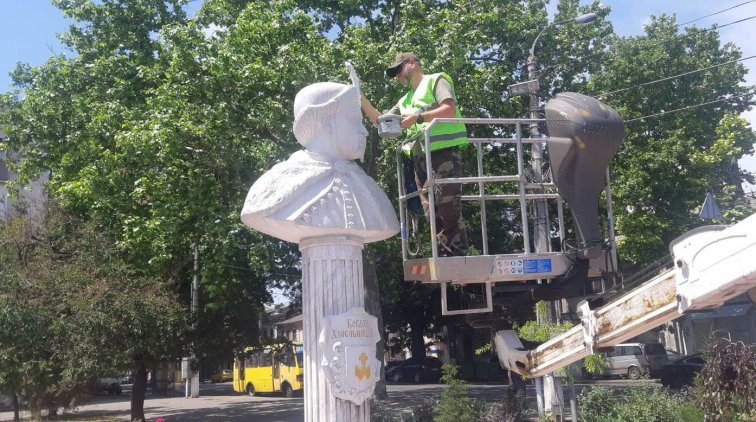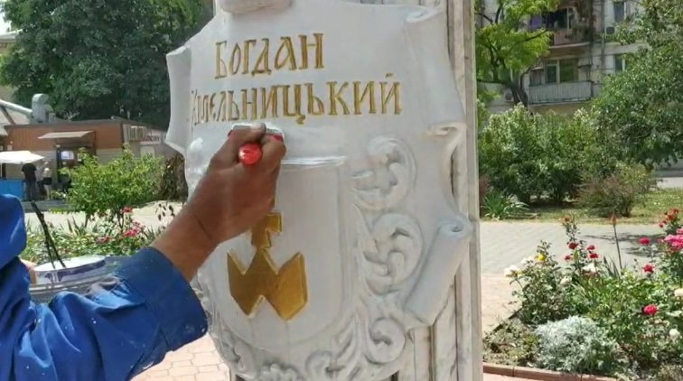 Работники КП «Сервисный центр» — специалисты участка по обслуживанию объектов монументального искусства, которые не являются культурным наследием, выполнили работы по косметическому ремонту памятника гетману Богдану Хмельницкому.