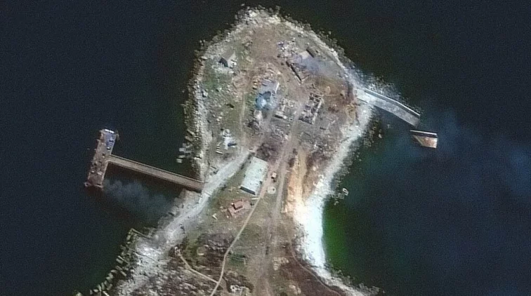 Фотографии были сделаны компанией Maxar Technologies уже после того, как оккупанты покинули свои позиции. Дым от пламени можно разглядеть в нескольких местах, в том числе в северной части острова.