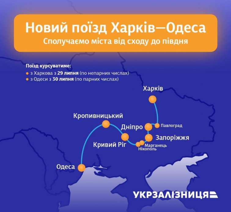 Новый поезд №288/287 сообщением Харьков — Одесса начнет курсировать с 29 июля. Он позволит соединить прямым железнодорожным сообщением города востока до юга Украины.
