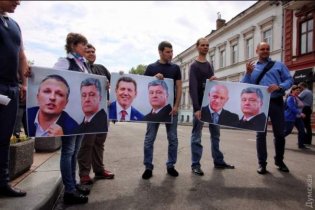 Так, участники акции держат в руках баннер с надписью «Одесса в плену бандитов та сепаратистов. Куда смотрит украинская власть», а также плакаты с изображением мэра города Генадия Труханова, лидера Украинской морской партии, нардепа Сергея Кивалова, рядом с которыми стоит непосредственно сам Пётр Порошенко.