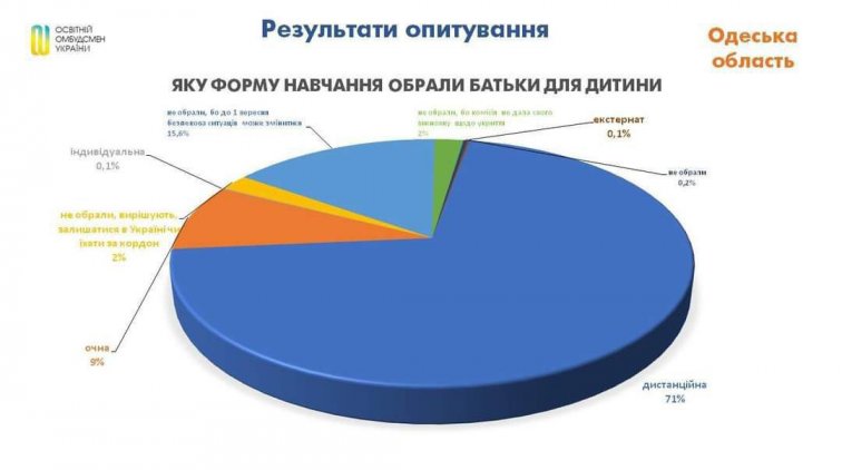 По итогам анкетирования 62,5% украинских родителей выбрали дистанционку для своих детей, 13,8% – очное обучение в учебном заведении. При этом 18,4% родителей еще не знают, какую форму обучения выбрать, поскольку до 1 сентября ситуация с безопасностью может измениться.