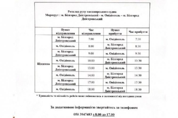 Отправка по новому графику будет производиться с 1-го причала Аккермана. За дополнительной информацией обращайтесь по телефону 0503947483 с 8.00 до 17.00.