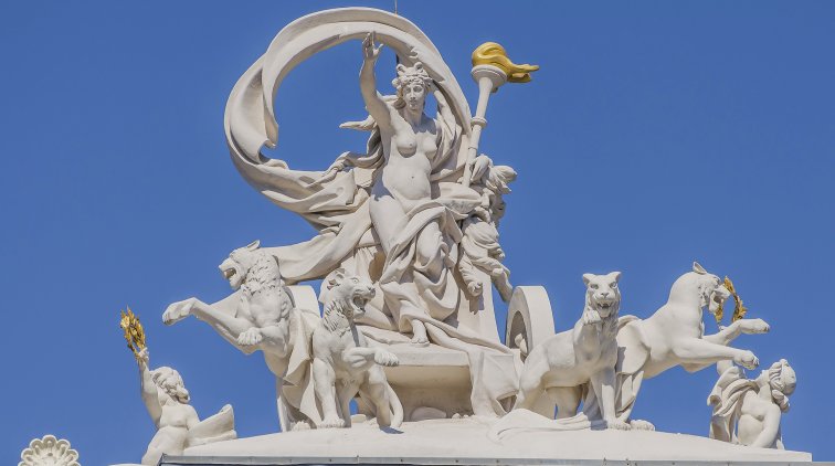 В самом верху есть масштабная скульптурная композиция: колесница, запряженная пантерами, ею руководит муза трагедии Мельпомена. Слева маска – символ трагедии и факел – символ негасимого огня искусства, правой рукой она приветствует гостей или зрителей.