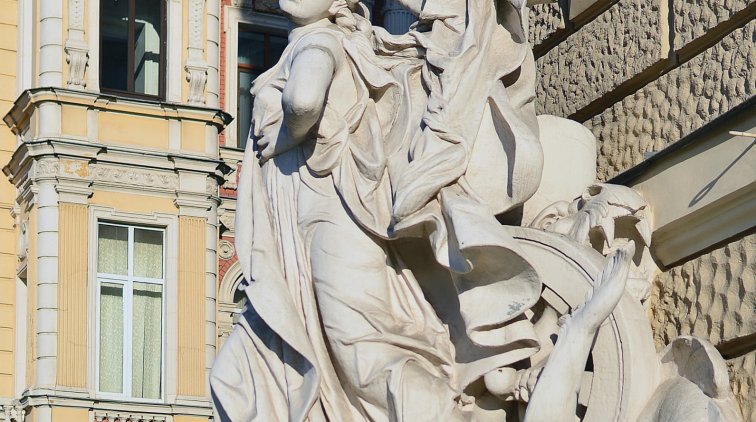 Еще ниже уровнем расположена парная скульптура над аркой, символизирующая небесный свод. Возможно, это Фамы, которые держат в руках факелы, освещающие путь тех, кто ступил на путь искусства. В руках у них еще и венки из лавра, прославляющие деяния людей и таланты. В замковом камне между скульптурами – профиль богини победы Ники.