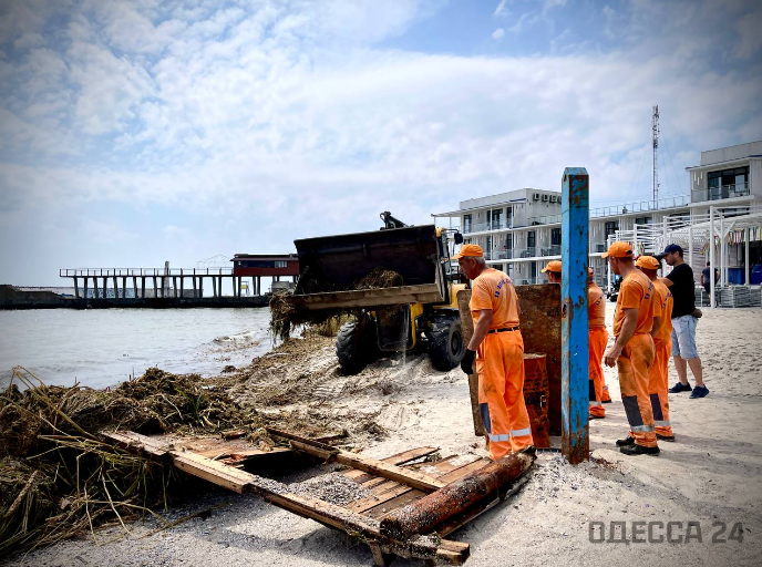 14 июня одесские коммунальщики приступили к уборке городских пляжей от мусора, принесенного течением из Днепра после уничтожения дамбы Каховской ГЭС.