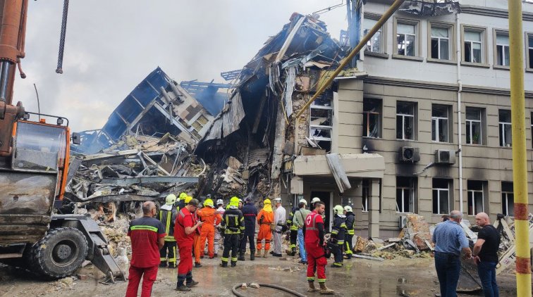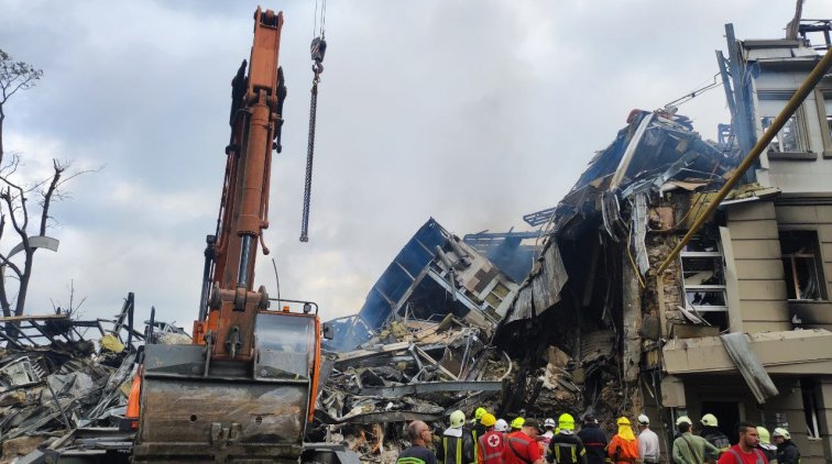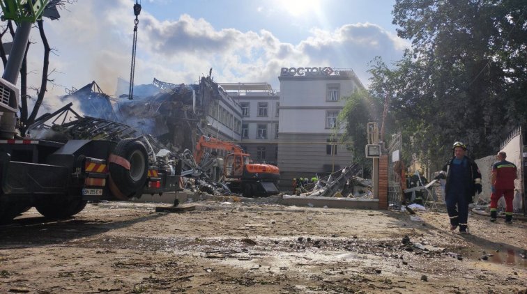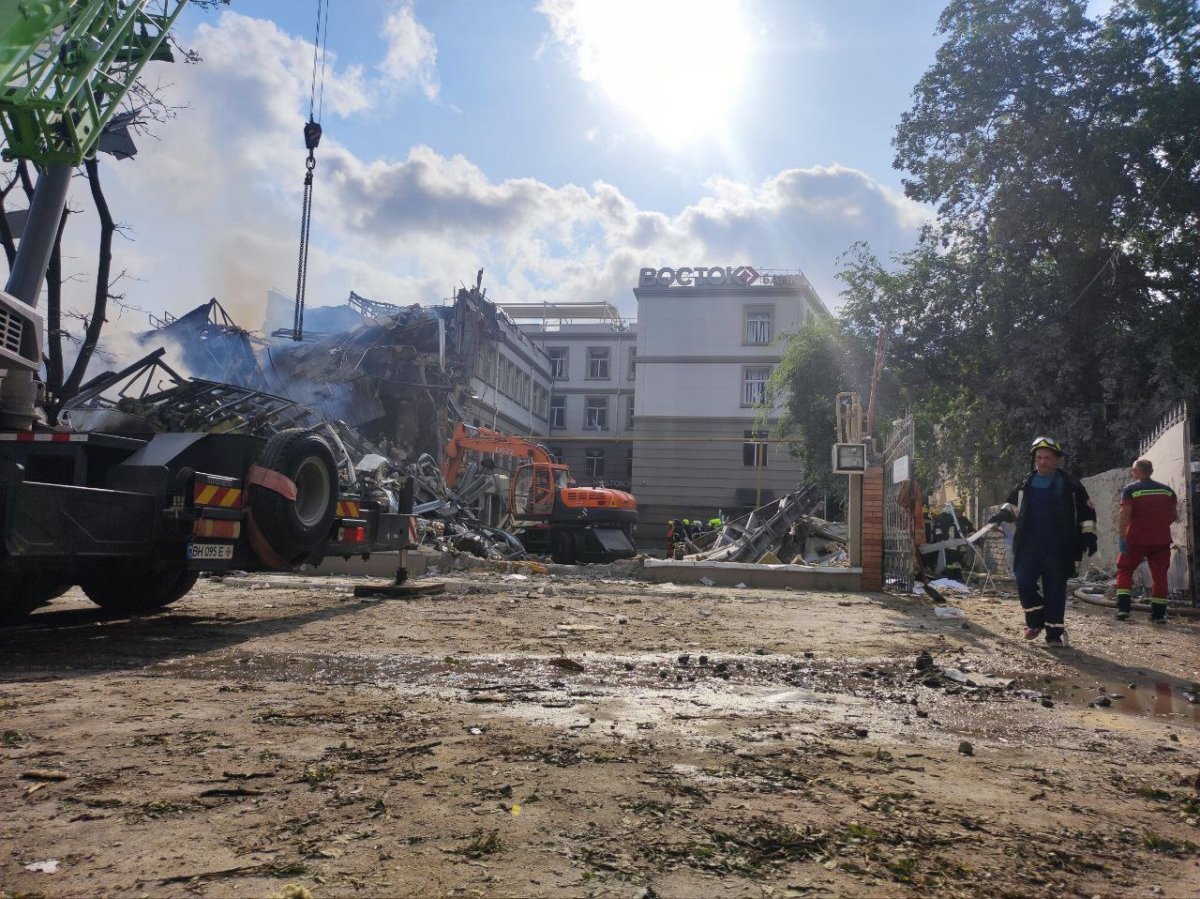 Во время ракетно-дроновой атаки на Одессу был разрушен головной офис банка "Восток" на Канатной. Спасатели разбирают завалы.