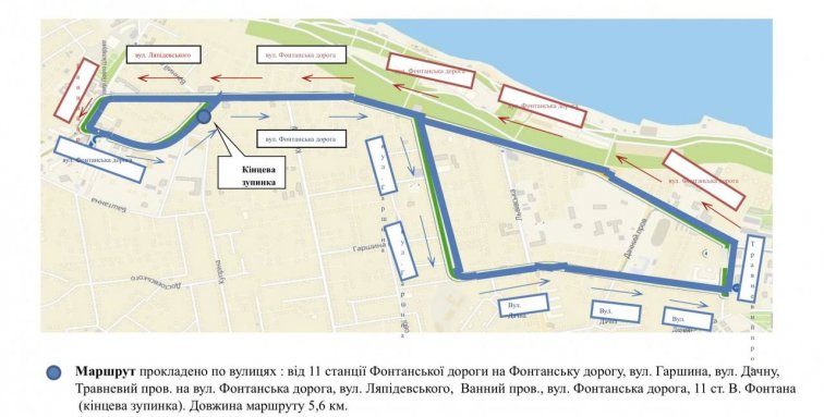 Маршрут: - от конечной остановки 11 ст. Большого Фонтана на Фонтанская дорога, ул. Гаршина, ул. Дачная, пер. Майский, Фонтанская дорога, ул. Ляпидевского, пер. Ванный, Фонтанскую дорогу, 11 ст. Большого Фонтана (конечная остановка).