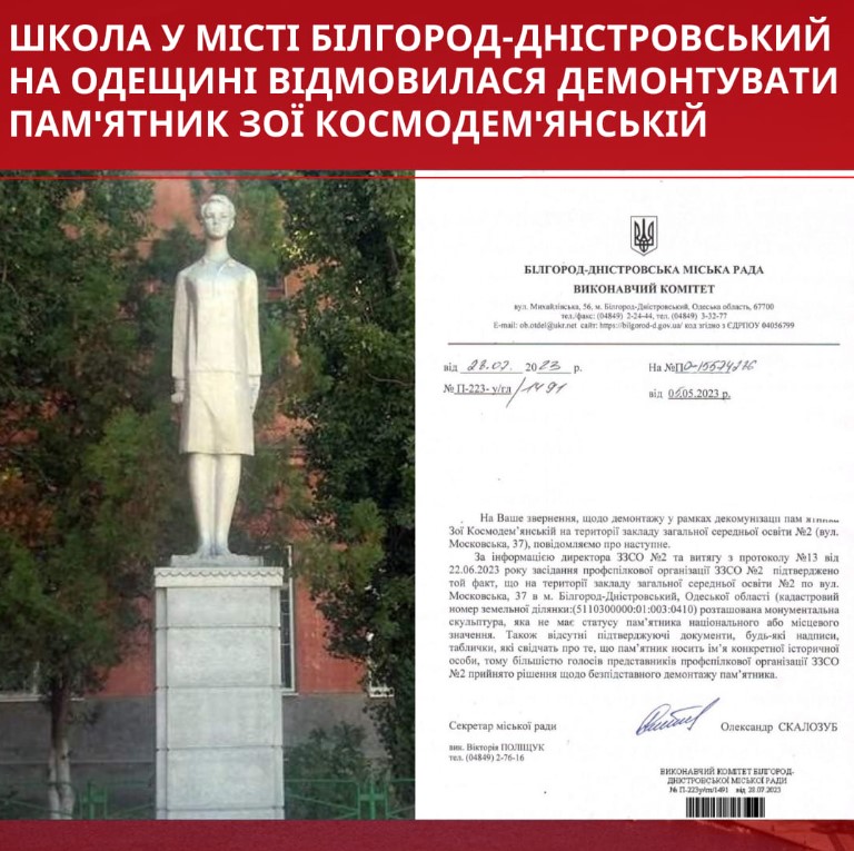 В Белгород-Днестровском решили сохранить памятник Зое Космодемьянской возле школы. Об этом на своей странице в Фейсбуке сообщила общественная организация «Декоммунизация.Украина».