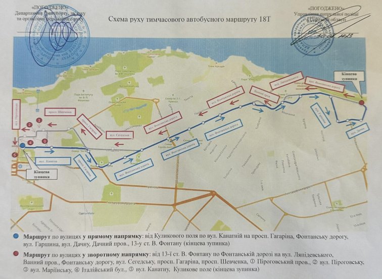 Схема движения автобуса 18Т: Куликовое поле (конечная остановка), Канатная, проспект Гагарина, Фонтанская дорога, Гаршина, Дачная, Дачный переулок, 13-станция В. Фонтана (конечная остановка). В обратном направлении от: 13 станции В. Фонтана, по Фонтанской дороге, ул Ляпидовского, Винный переулок, Фонтанская дорога, Сегедская, проспект Гагарина, проспект Шевченко, переулок Пироговский, ул Пироговская, Мариинская, Итальянский бульвар, Канатная, Кунатная ).