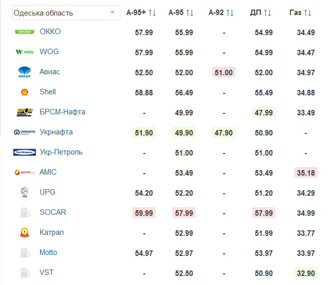 Дизельное топливо дороже всего продают на АЗС SOCAR – 57,99 грн/л. Далее по стоимости находится АЗС Shell, где цена выросла до 55,49 грн/л. На АЗС ОККО и WOG цена удерживается на уровне 54,99 грн/л. Дешевле всего на АЗС БРСМ-Нефть здесь стоимость дизеля – 47,99 грн/л.