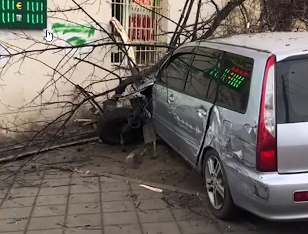 Водитель легкового автомобиля, двигаясь в сторону площади 10 Апреля, на перекрестке Черняховского и Говорова чуть не столкнулся с авто охранной службы «Зевс». В результате маневра автомобиль Mitsubishi вылетел через пешеходный переход на тротуар, врезался в упавшее дерево, остановившее машину перед стеной дома.