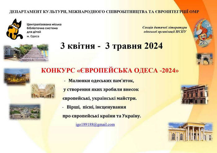 В Одесской мэрии предлагается принять участие в фестивале-конкурсе «Европейская Одесса». Он продлится с 3 апреля по 3 мая 2024 года. Цель фестиваля-конкурса – раскрыть таланты детей и взрослых в создании рисунков, скульптуры, декоративно-прикладного творчества с изображением памятников Одессы, созданных с участием европейских и украинских мастеров; стимулирование к изучению и исполнению музыкальных и литературных европейских и украинских композиций.