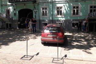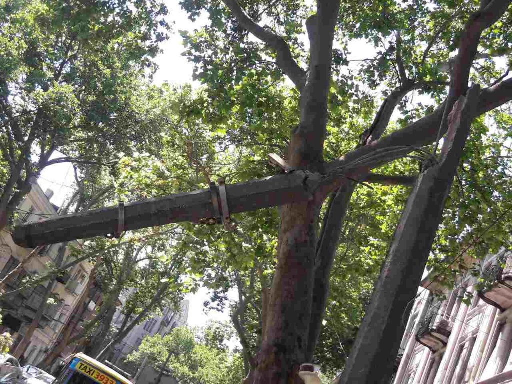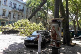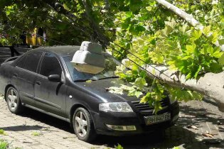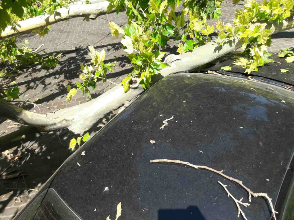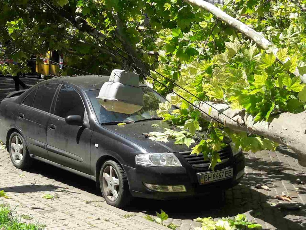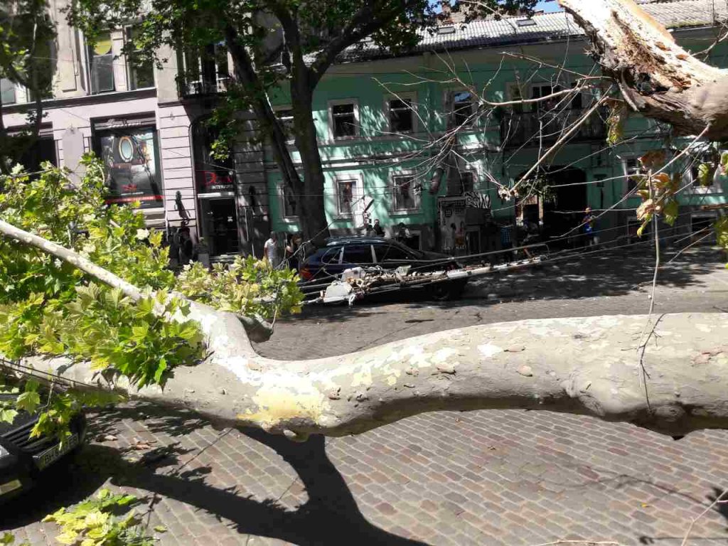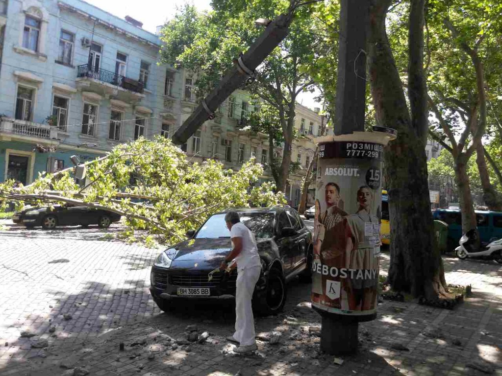 Дерево рухнуло на проезжую часть, оборвав линии электропередач и разломав пополам опору. В свою очередь, бетонный столб упал на автомобиль Porshе.