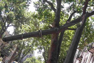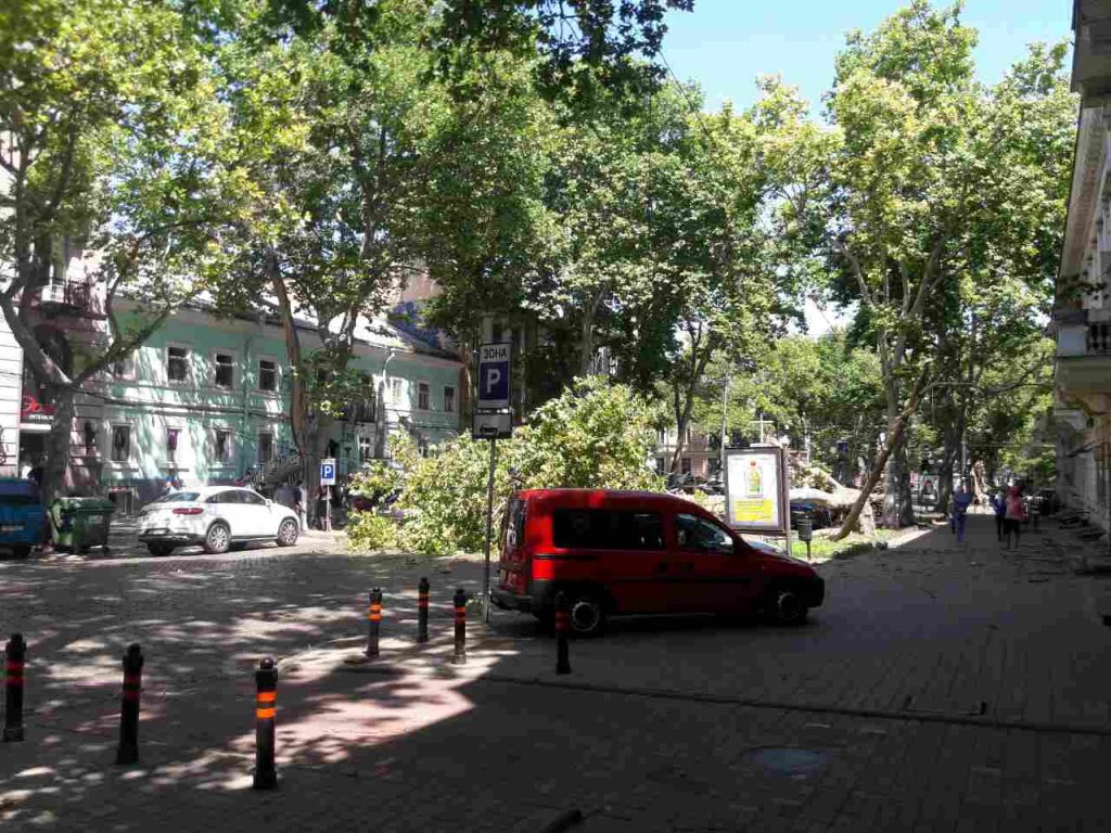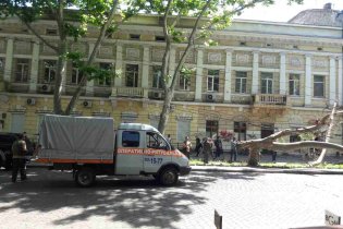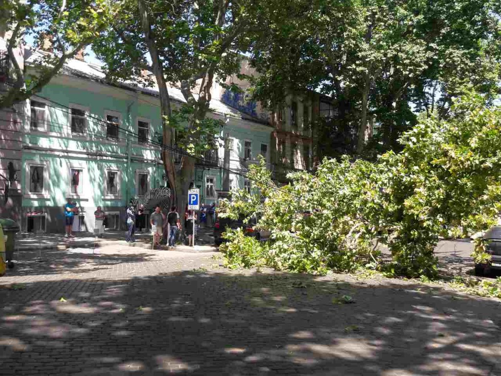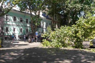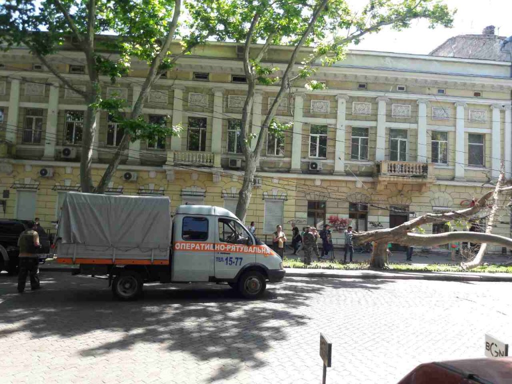 Движение на Пушкинской на участке от Троицкой до Еврейской перекрыто. Работники КП «Горзелентрест» разрезают дерево и убирают его с дороги.