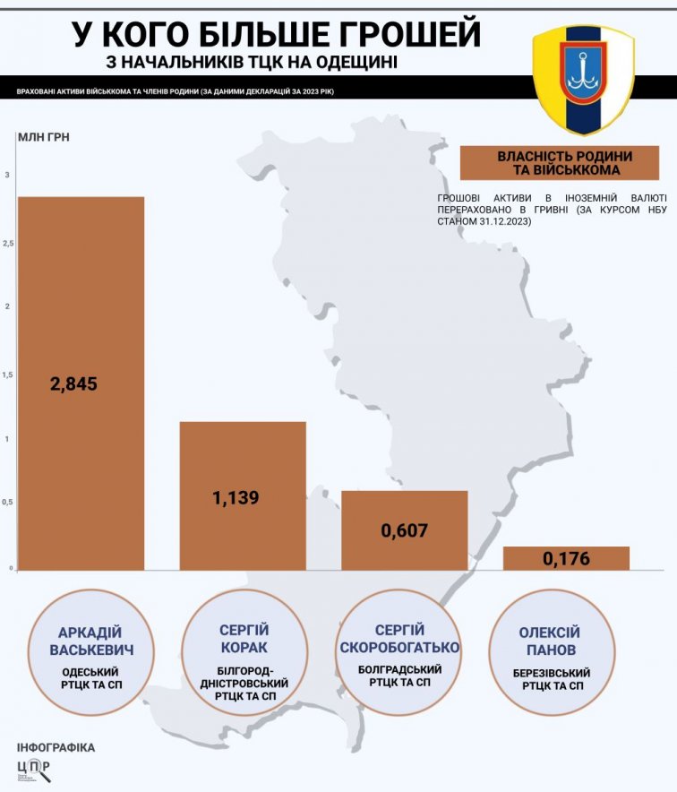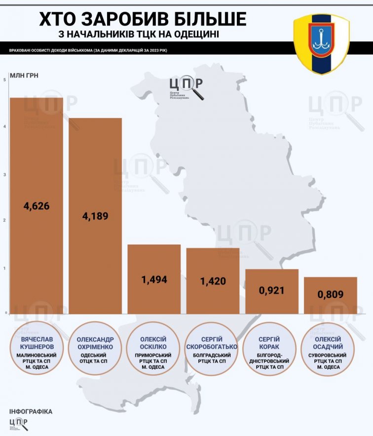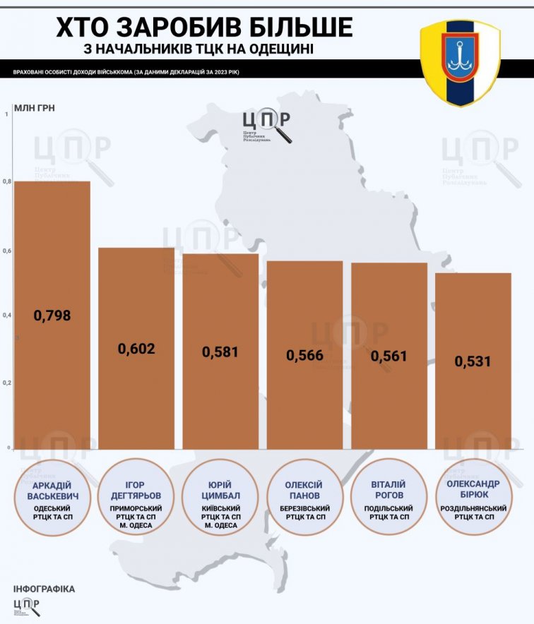 Руководители Белгород-Днестровского, Суворовского и Одесского районных центров комплектования Сергей Корак, Алексей Осадчий и Аркадий Васькевич задекларировали 921 тысячу гривен, 809 тысяч и 798 тысяч гривен дохода соответственно.