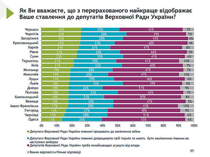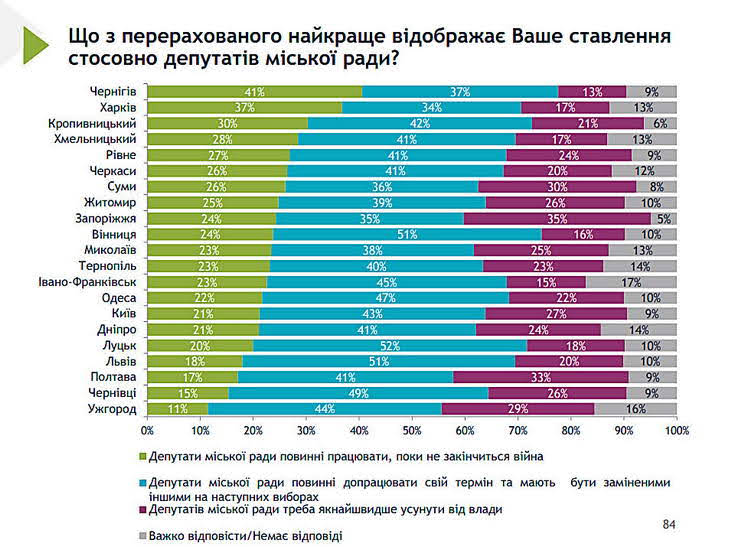 Отношение к депутатам городского совета немного хуже, чем к Труханову – им доверяют в Одессе только 22% одесситов, а 22% считают, что их нужно немедленно отстранить от власти. Еще 47% считают, что его нужно заменить на следующих выборах, но после войны.