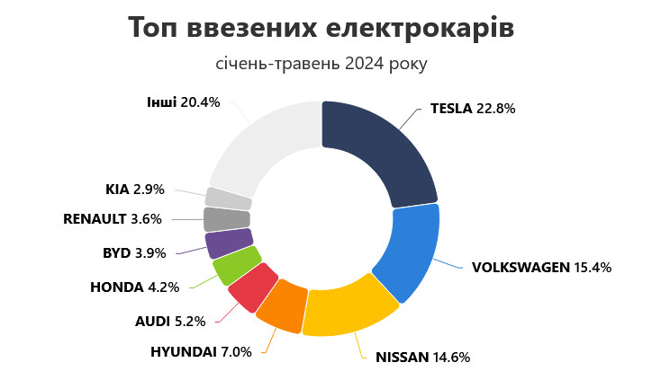 Самой популярной маркой стала Tesla — почти 5 тысяч машин, или 22,8%. Второе место занимает Volkswagen (3,1 тыс., 15,4%), а замыкает тройку лидеров — Nissan (3 тыс., 14,6%). Модели-лидеры среди "электричек" — Nissan Leaf, Tesla Model 3 и Volkswagen ID.4.
