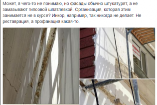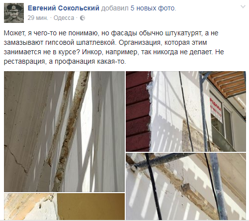 «Может, я чего-то не понимаю, но фасады обычно штукатурят, а не замазывают гипсовой шпатлевкой», - сокрушается на своей страничке в Facebook Евгений Сокольский, наблюдая за реставрацией фасада здания по адресу: Дерибасовская,10.