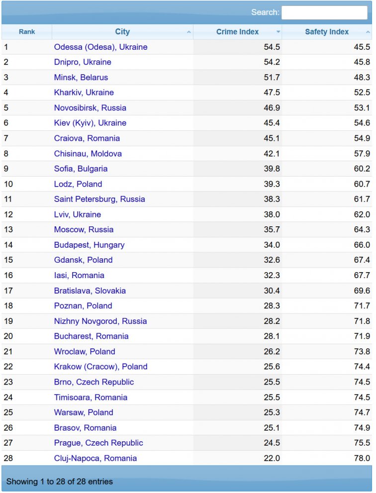 Среди украинских городов в антирейтинге первое место — за Одессой, индекс преступности здесь 54,5. Сразу после — на второй строчке — Днепр с показателем в 54,2. Харьков занимает четвертую позицию в рейтинге криминальных городов Восточной Европы с индексом 47,5.