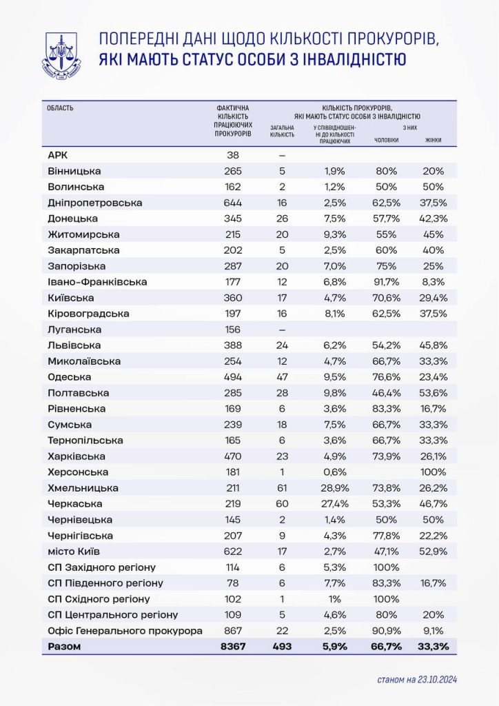 В остальных прокуратурах и в центральном аппарате Офиса Генерального прокурора число прокуроров с инвалидностью не превышает 10% от общего количества сотрудников. В частности, в 18 прокуратурах доля таких прокуроров составляет менее 5%, а еще в 11 – от 5 до 10%. В самом Офисе Генерального прокурора 22 прокурора имеют статус инвалидов, что составляет 2,5% от общего числа сотрудников центрального аппарата.