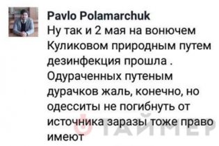Активист одесского отделения партии «Демократический альянс» Павел Поламарчук считает, что Куликово поле являлось «источником заразы», а трагедию, в ходе которой погибли 48 человек, назвал «дезинфекцией естественным путём».