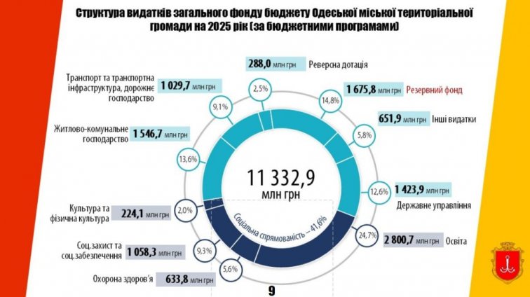 Более 40% расходов (4,7 миллиарда гривен) планируется потратить на образование, социальную защиту, медицину, культуру и спорт. Программы социальной поддержки получат более 1 миллиарда гривен, что на 80 миллионов больше, чем в прошлом году. Средства будут распределены на помощь малообеспеченным слоям населения (590 миллионов гривен), программу "Ветеран Одессы" (156 миллионов гривен), программу «Несокрушимая Одесса» (95 миллионов гривен), программу «Равенство» (12 миллионов гривен) и другие проекты (23 миллиона гривен).