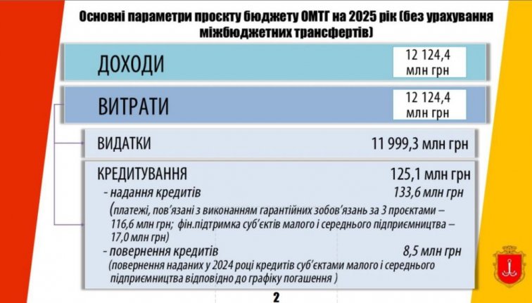 Общий объем бюджета Одессы на 2025 год составляет 12,124 миллиарда гривен. Из них доходы общего фонда рассчитаны на сумму 11,79 миллиарда гривен. В структуре доходов 96,3% составляют налоговые поступления, включая налог на доходы физических лиц, единый налог, налог на имущество, акцизный налог и местные сборы.